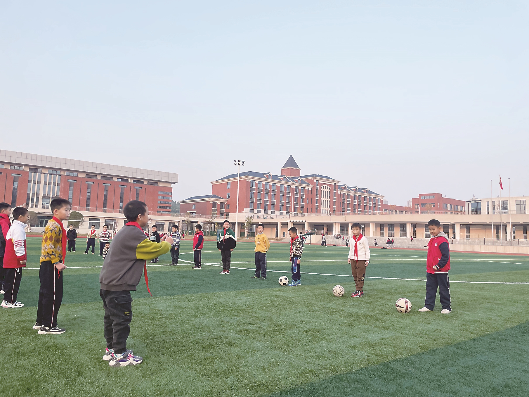 ▲昨日,随着天元区、芦淞区、石峰区的小学生正式返校,全市中小学已实现全面返校复课。图为市二中枫溪学校小学部东校区的学生正在上足球课。