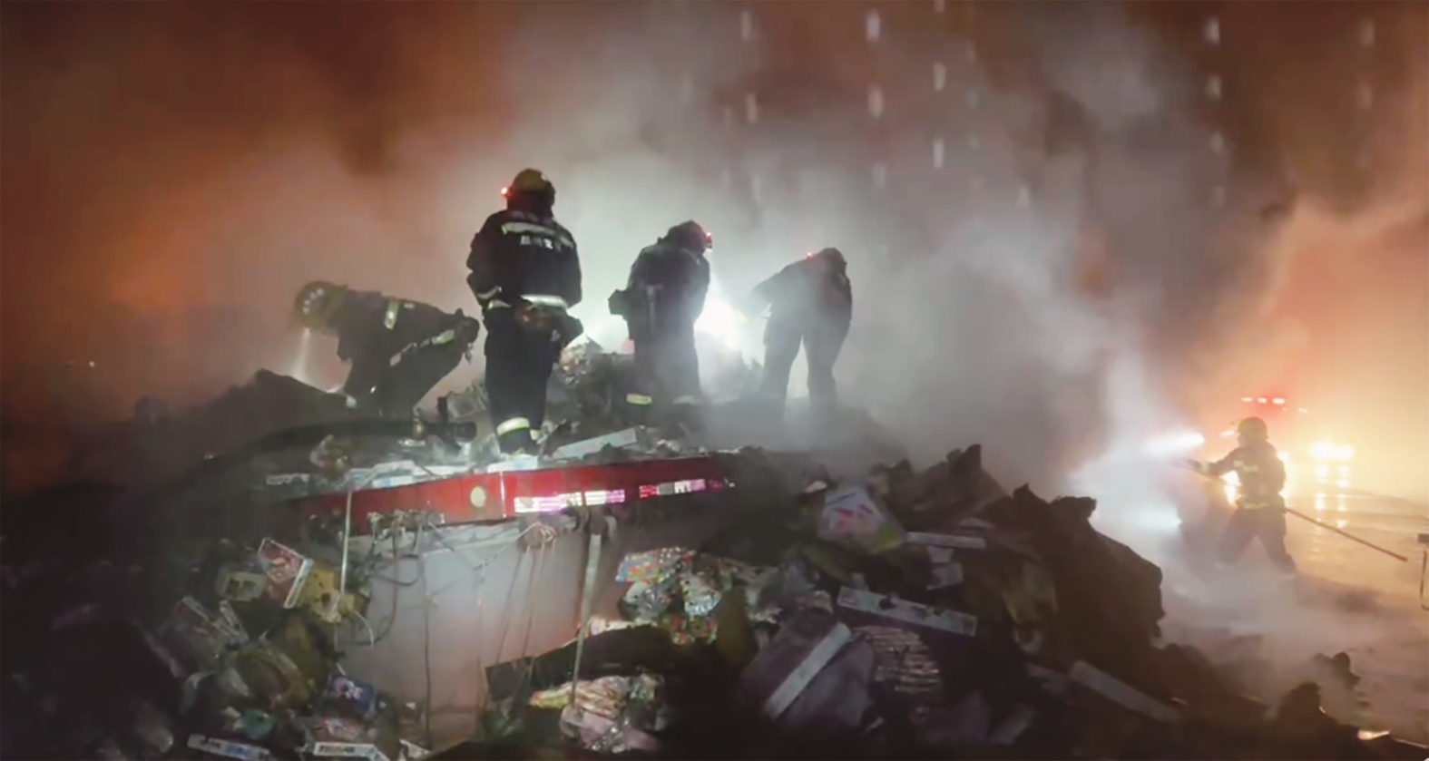 ▲消防员奋力扑救着火大挂车。通讯员供图