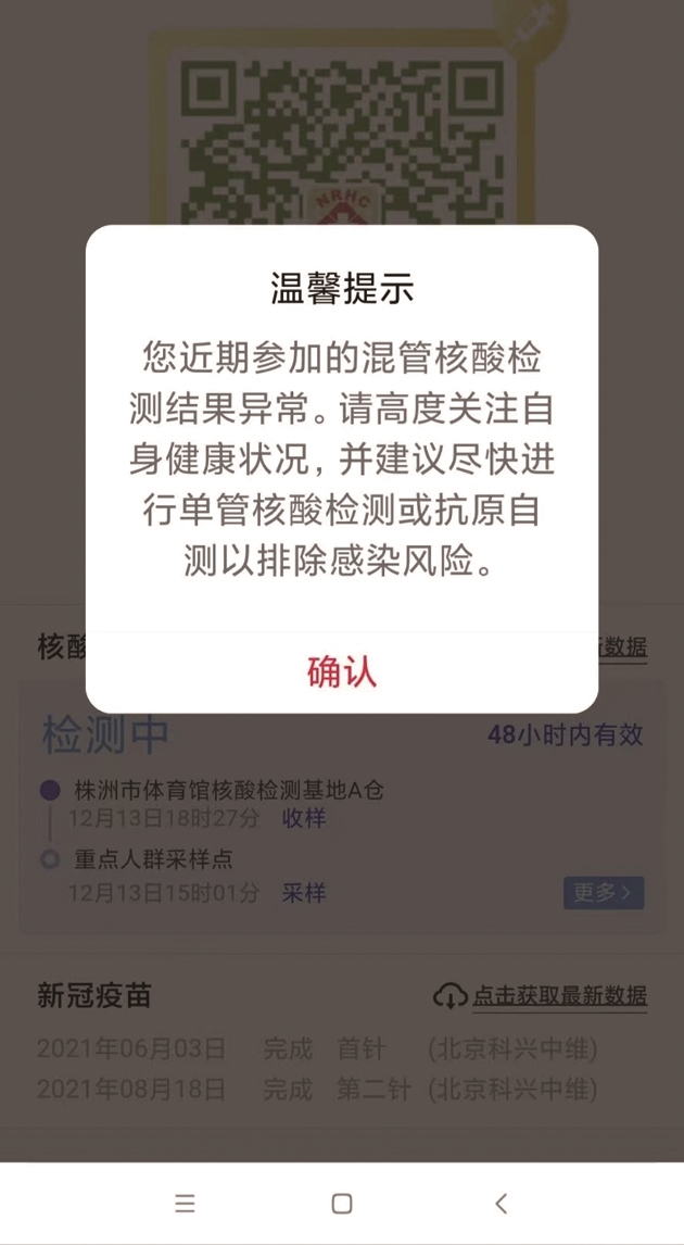 ▲小邱核酸混管异常的弹窗提醒。 记者/杨凌凌 摄