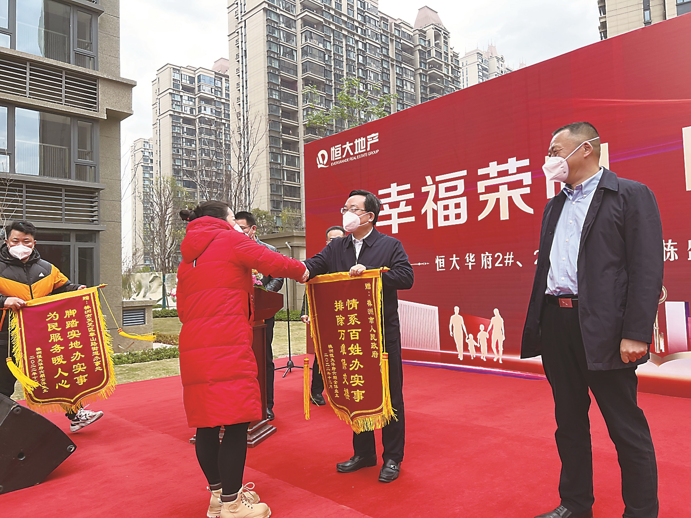 ▲交房仪式上,业主代表为市政府、天元区政府以及工作专班送上锦旗。记者/李毅哲 摄