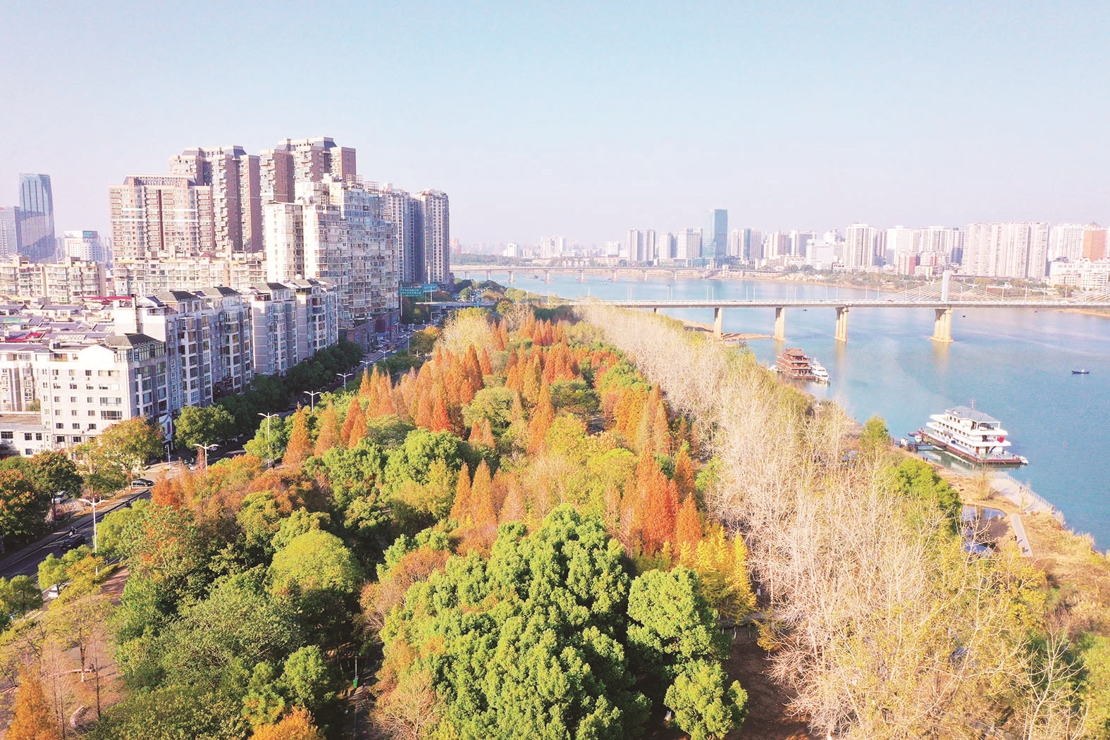 近日,河西湘江风光带,色彩斑斓的树木与碧蓝的江水相互映衬,构成一幅美丽的生态画卷。