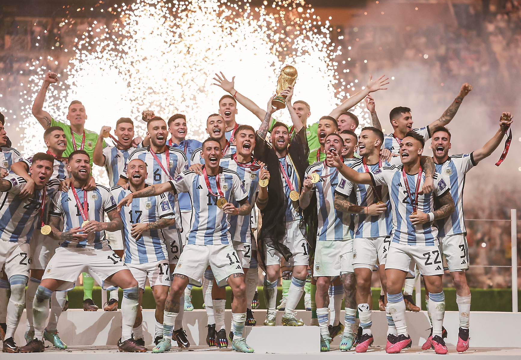 ▲当地时间12月18日,在卡塔尔卢赛尔球场进行的2022卡塔尔世界杯足球赛决赛中,阿根廷队与法国队在常规时间和加时赛战成3比3平,通过点球大战阿根廷队以总比分7比5获胜,夺得冠军。图为阿根廷队球员在颁奖仪式上庆祝。 新华社记者 曹灿 摄