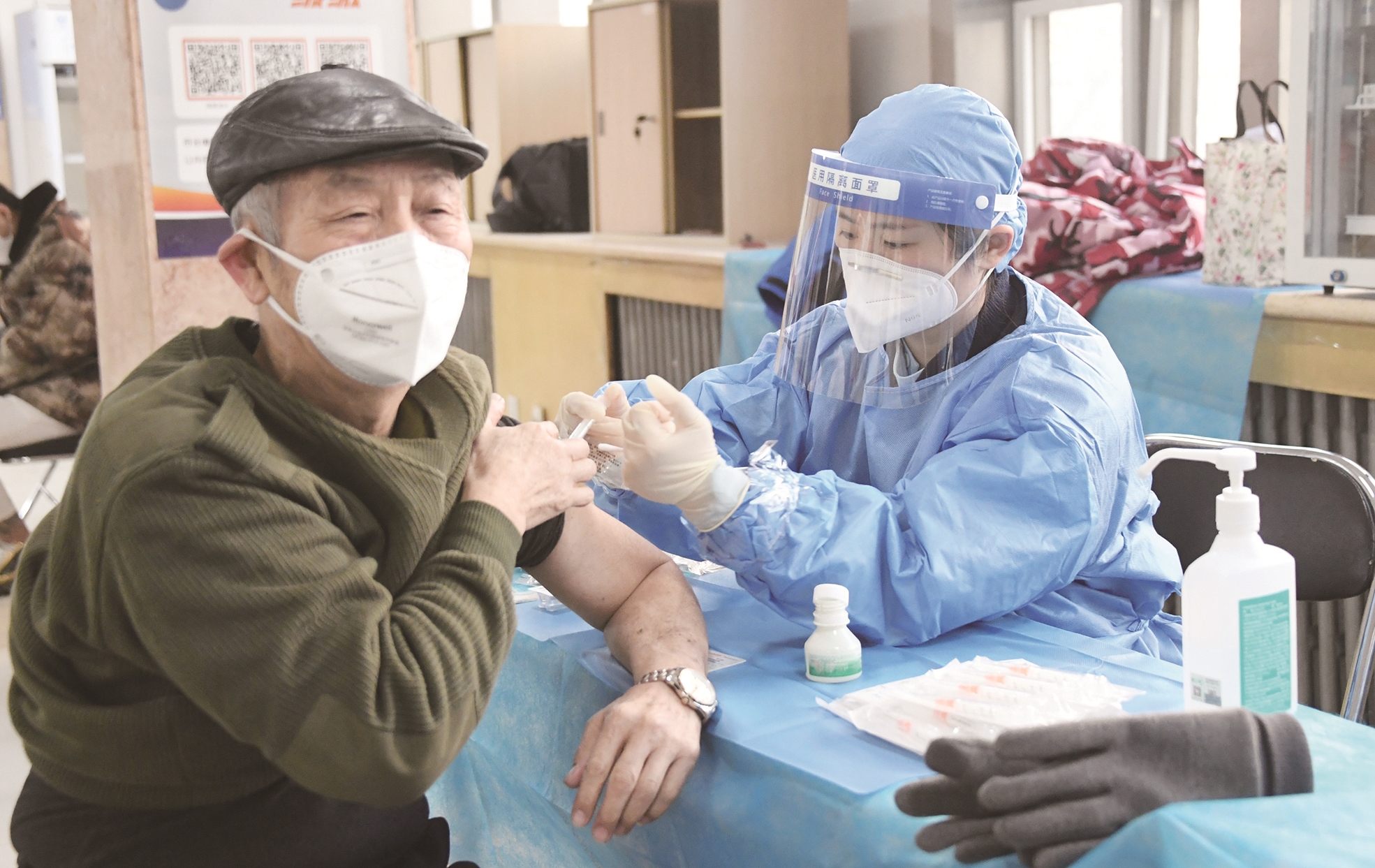▲12月15日,在北京市海淀区中关村街道新冠疫苗接种点,医护人员为老年人接种新冠疫苗。新华社记者/任超 摄