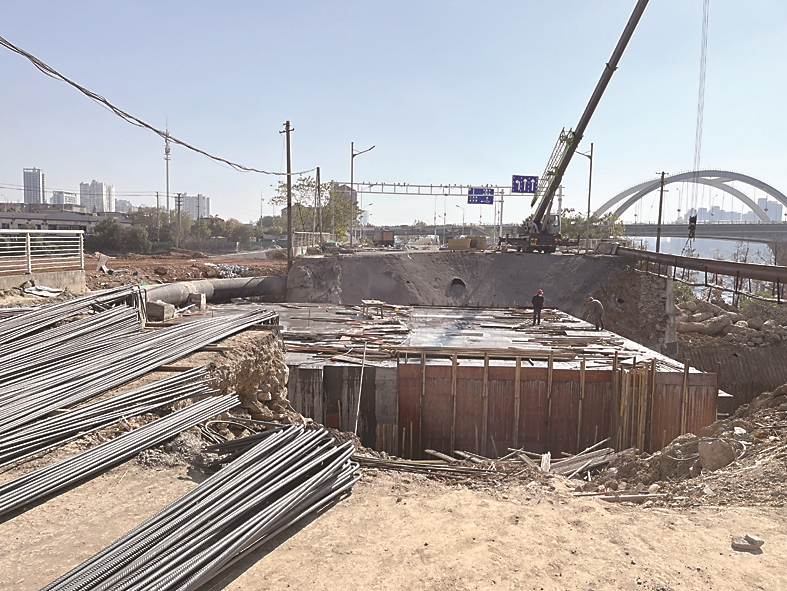 ▲彩虹桥桥头的沿江路路段正在施工。 记者/刘平 摄