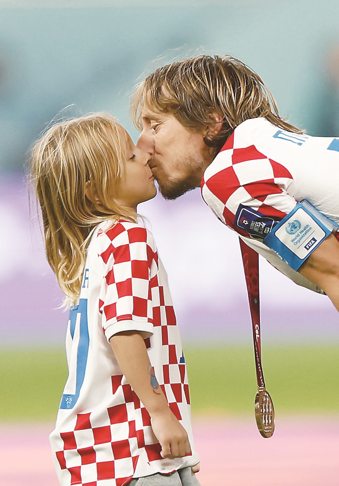 莫德里奇把奖牌挂在小女儿索菲亚的脖子上,和儿子伊万诺、大女儿艾玛一起拍照。刚摆好姿势拍了几张,伊万诺却跑开了,他追逐着皮球满场飞奔。不知道已经满脸沧桑的莫德里奇放眼望去,是否看到了自己少年时代的影子。