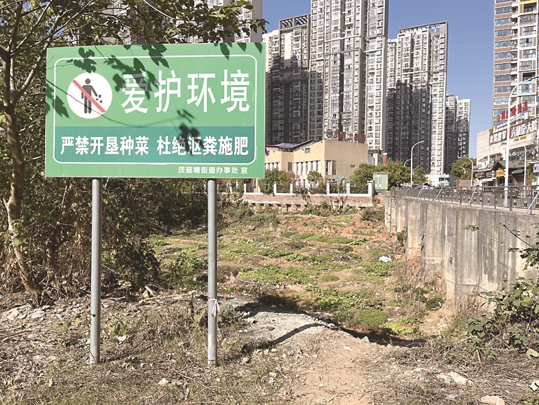 在交叉路口处,茨菇塘街道办事处竖立了警示牌,要求“爱护环境,严禁开垦种菜,杜绝沤粪施肥”,但种菜的人视而不见。