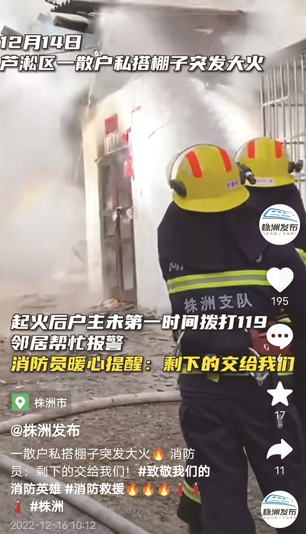 12月14日,芦淞区一散户私搭棚子突发大火。起火后,户主未第一时间拨打119电话,邻居帮忙报警。消防员暖心提醒:“起火后要第一时间报警,最重要的是保证自己人身安全,然后剩下的交给我们。”
