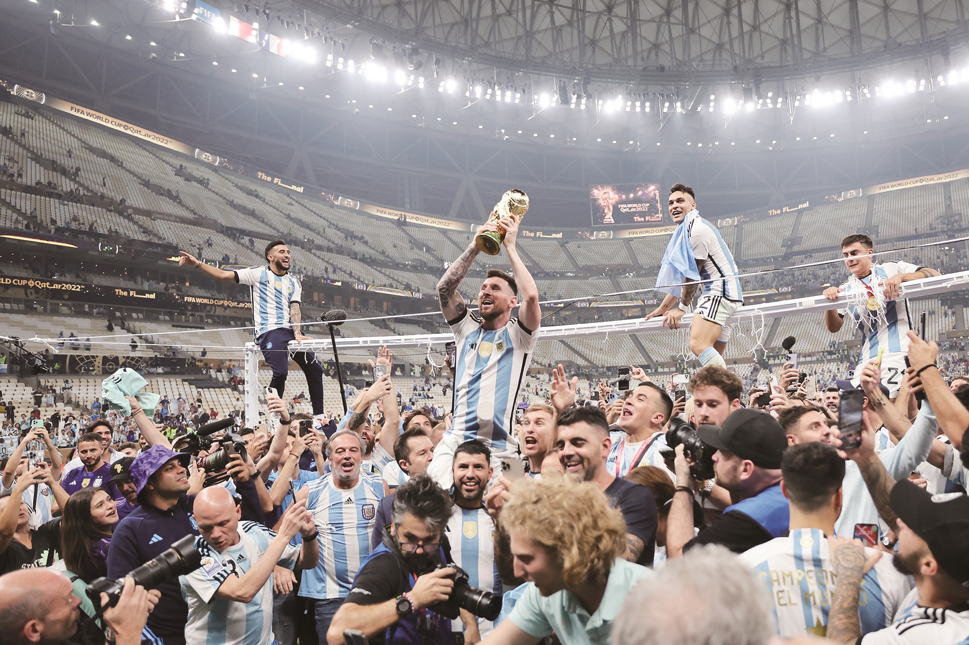 ▲12月18日,阿根廷队球员梅西(上左二)在比赛后手捧大力神杯庆祝。新华社记者/曹灿 摄