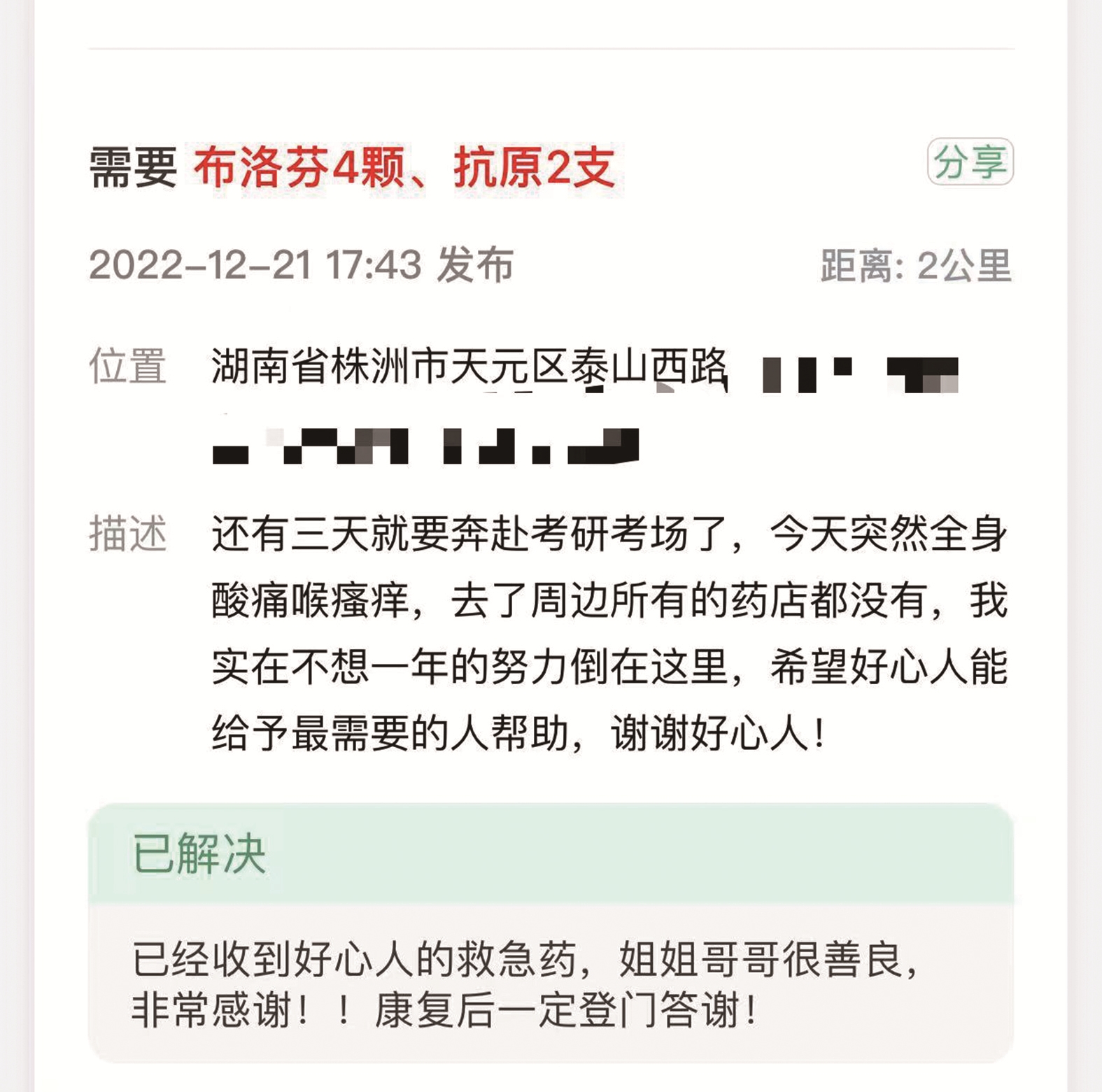 “我马上就要参加研究生考试了,这几天有些感冒、发烧症状。希望有好心人能帮帮我,不想一年的努力都白费了。”12月22日一大早,家住天元区泰山西路的吴同学在平台上发布了一条求助信息。当天下午,她就收到了爱心市民送的布洛芬、抗原等药品和物资。