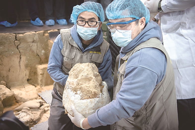 ▲12月3日,考古队员展示提取离土的头骨化石。 新华社记者/伍志尊 摄