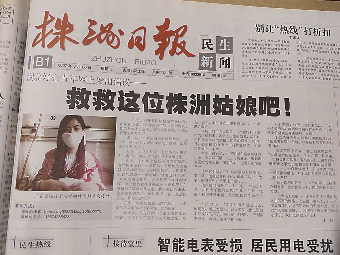 ▶2007年3月20日《株洲日报》刊登救助向海叶的相关报道。(资料图)