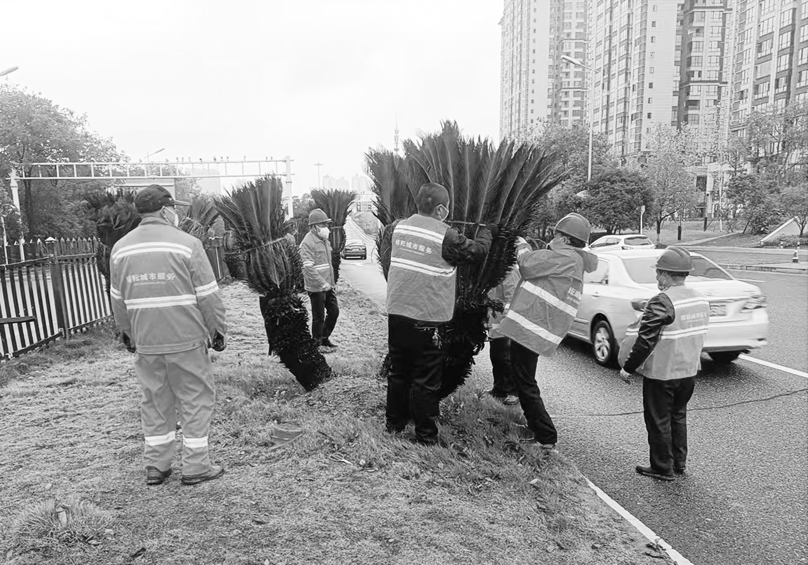 ▲炎帝大道上,园林工人帮铁树防冻。 通讯员供图