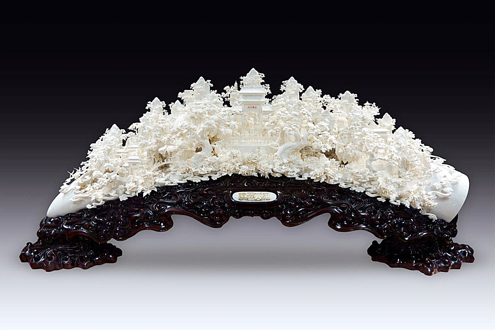 张民辉擅长牙雕、骨雕技艺。全面熟练掌握浮雕、立雕、镂空雕、微雕和镶嵌等象牙雕刻技法。作品包括人物、动物、山水、花鸟、楼台、宫灯、龙船、牙球等。牙雕是一门古老的传统艺术,也是一门民间工艺美术。牙为大象身上最坚固的部分,其光洁如玉,有“有机宝石”之美誉。而象牙雕刻艺术品,以坚实细密,色泽柔润光滑的质地,精美的雕刻艺术,倍受收藏家珍爱。联合国“濒危野生动植物物种国际贸易公约”禁止象牙原料及象牙制品贸易。2015年,作为牙雕大国的中国,禁止与象牙有关的贸易。象牙材料的稀缺促使张民辉探索用牛骨代替象牙。然而牛骨脆弱,容易霉变,体积小且心空,但牛骨却取之不尽,用之不竭。于是,张民辉创造了骨料脱脂净化新技术,它能令骨头脱脂漂白后久不发霉,从而使骨雕替代牙雕的生产发展迈出了极为重要的一步。此作品按原支象牙形设计构图,采用拼接、镶嵌技术细腻地雕镂出岭南山色幽雅、四时花木茂盛、鸟语花香的秀丽风光。近前,雍容华贵的牡丹尽情绽放,更有瑞鹤祥云伴随着福禄寿三星相聚于如意吉祥牌坊下,精雕细刻,最小的人物不足1厘米大小。极尽渲染了一幅歌舞升平、国泰民安的立体画卷。