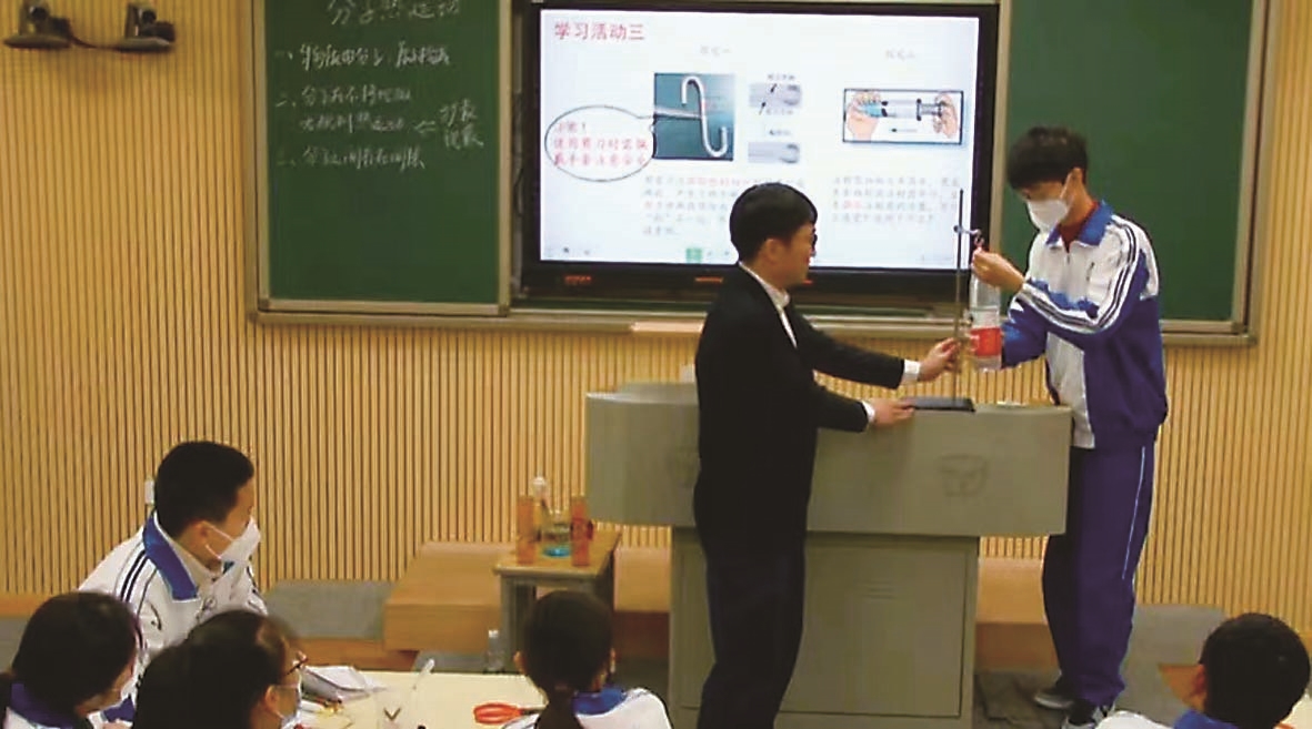 课堂中,蒋坤老师通过自制分子引力和斥力模型,并用红豆和小米模拟分子间存在间隙,通过物理建模和创新实验探究,帮助学生突破理解上的困难。用问题驱动思维,在师生互动中引导学生设计实验方案并完成实验操作,熟练运用手机投影等现代化技术,关注学生课堂反馈,使课堂务实高效。