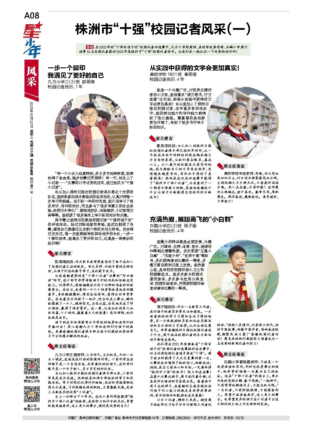 周子涵妈妈:作为一名教育工作者,我对孩子的教育非常关注和重视。一方面重视他的学习习惯和生活习惯的培养,另一方面鼓励他多参加社会实践活动和各方面的才艺培养,从而全面发展自己。非常感谢株洲日报社校园记者这个平台,周子涵在校园记者的各方面活动中都受益匪浅。