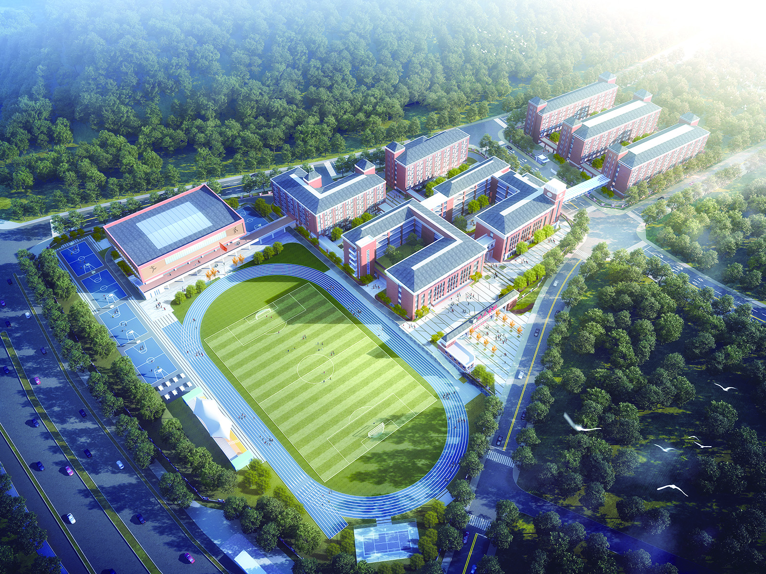 ◆美丽校园 学校总投资6.2亿元,占地面积101亩,建筑面积近8万平方米,可开设60个教学班,容纳学生3000人。学校拥有各类标准的活动场馆、先进的教学设备、完备的生活设施。