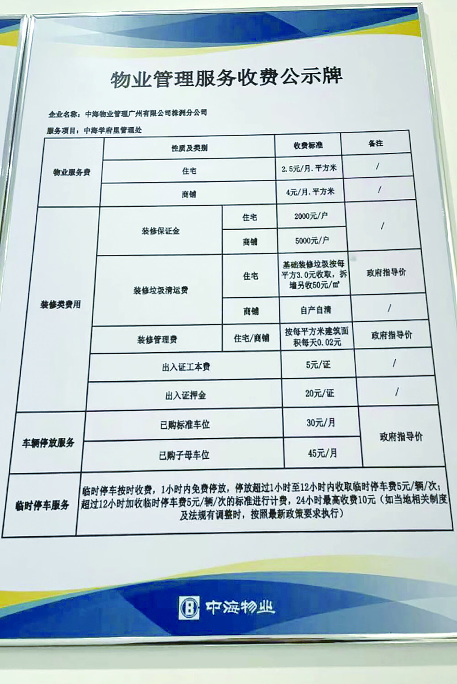 在中海学府里物业管理处,记者看到了“物业管理服务收费公示牌”,其中有提供临时停车服务。临时停车实行按时收费:1小时内免费停放;停放超过1小时至12小时内收取临时停车费5元/辆/次;超过12小时加收临时停车费5元/辆/次;24小时最高收费10元/辆/次。“之前按这个收费标准提供临时停车服务,业主们普遍没有异议。”一名业主称。