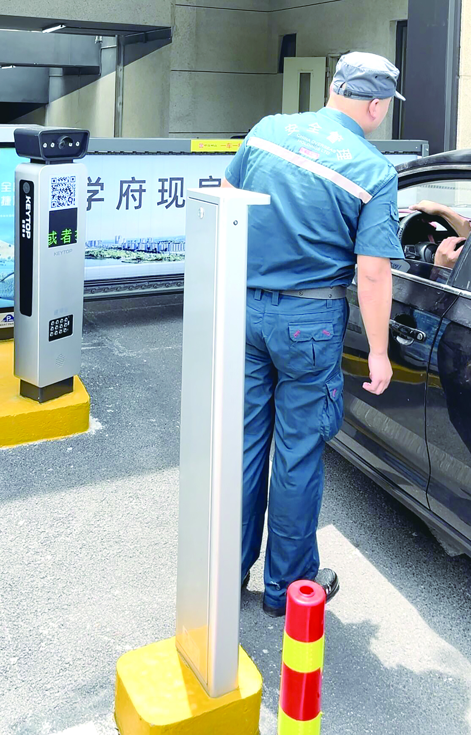 “临时车禁止入场,请刷卡或者扫码进场。”7月3日上午11时20分左右,有临时车驶入时,道闸栏杆没有抬起放行。保安询问确认车主是小区业主后,才抬杆放行。