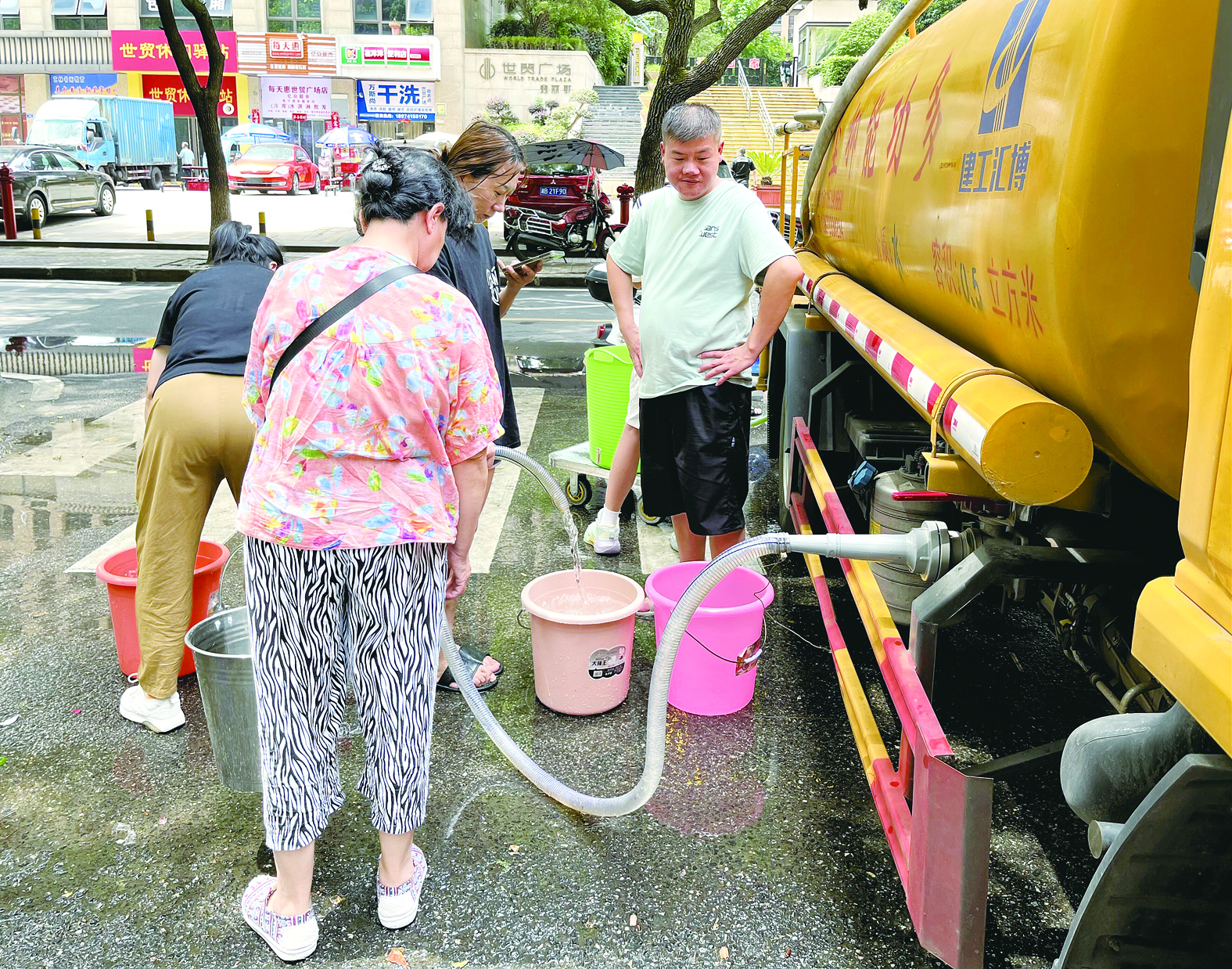 7月4日,荷塘区茨菇塘路一处供水管道出现爆裂,工人进行抢修,路边的世贸广场小区等出现“用水荒”现象。下午2时左右,记者走访发现,一辆多功能抑尘车停在世贸广场小区出入口,周边居民纷纷提着水桶赶来接水。