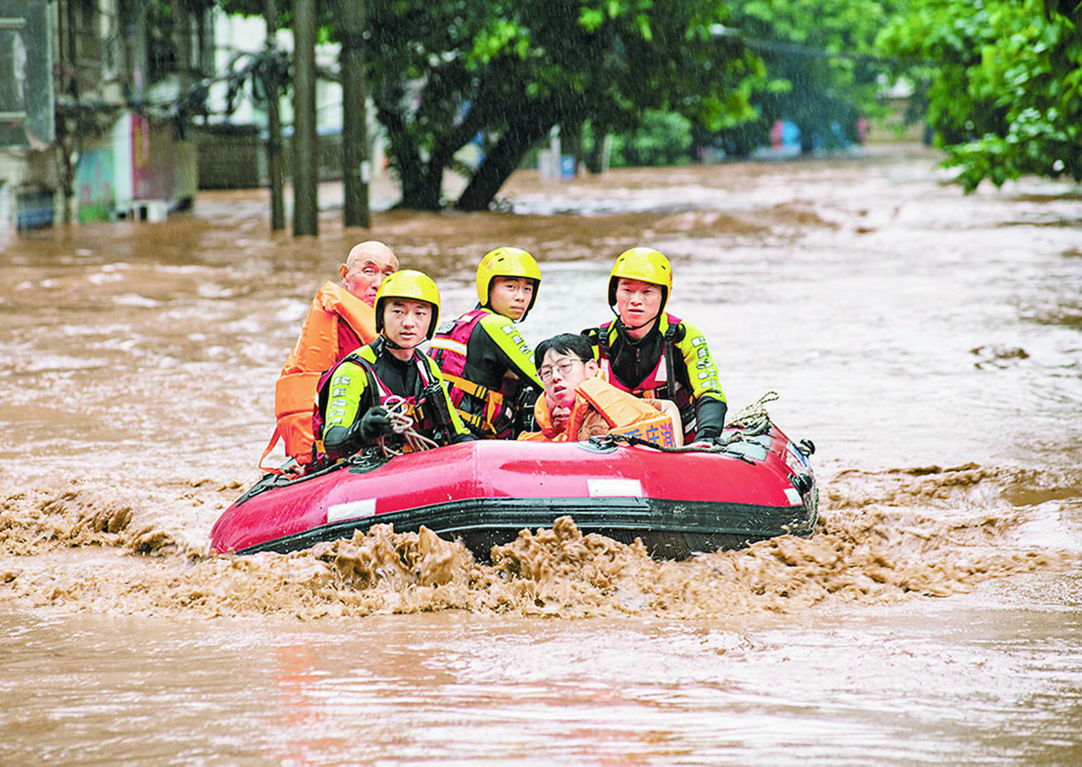 7月4日,重庆万州城区,救援人员正在转移受困居民。连日来,重庆市出现特大暴雨,截至7月5日10时因灾死亡15人,失踪4人。灾情发生后,万州区委、区政府立即开展抢险救灾,共出动抢险力量2500余人次。 图据重庆日报