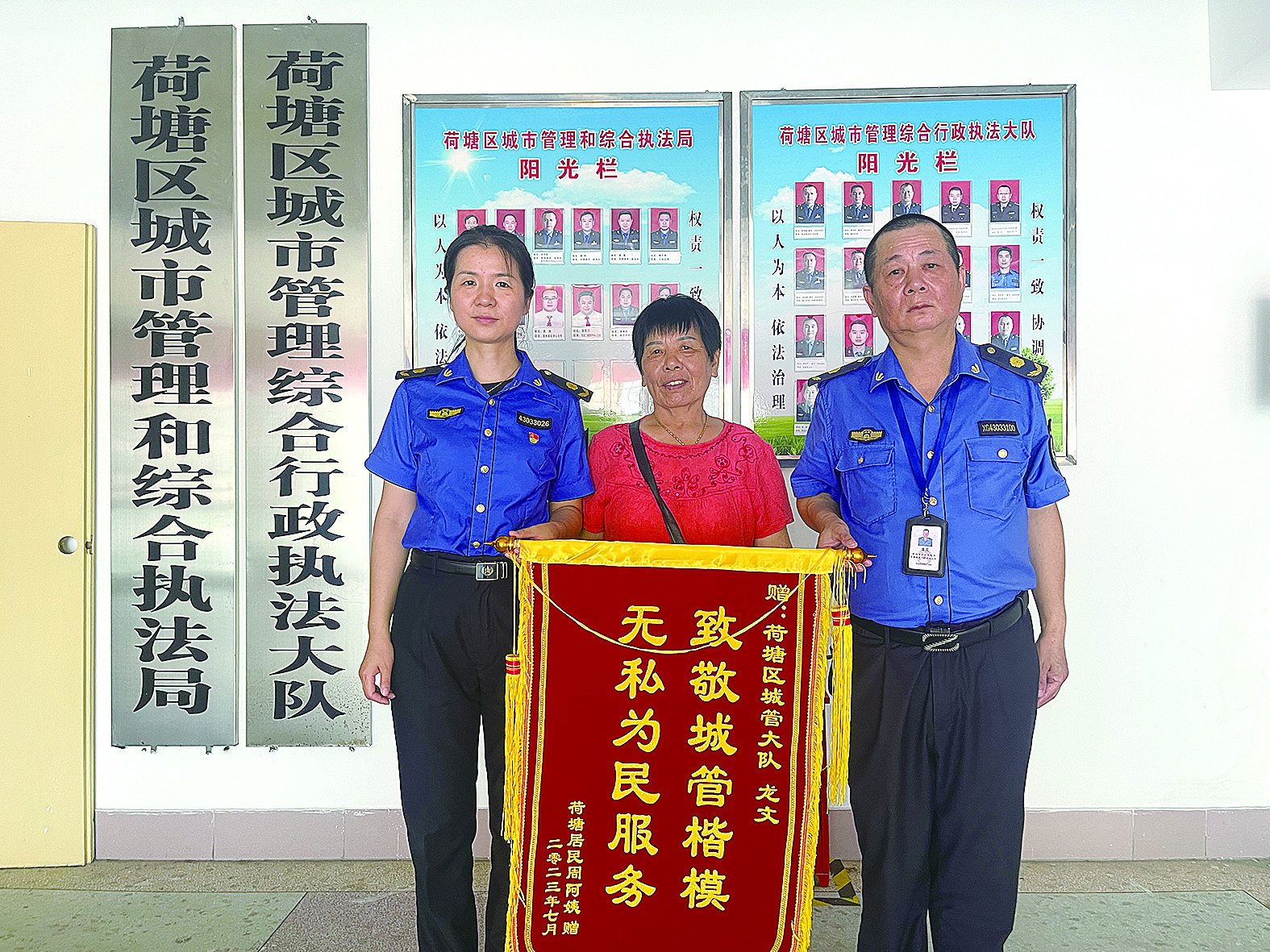 周配兰给荷塘区城管队员龙文(右一)送来锦旗。 记者/伍靖雯 摄