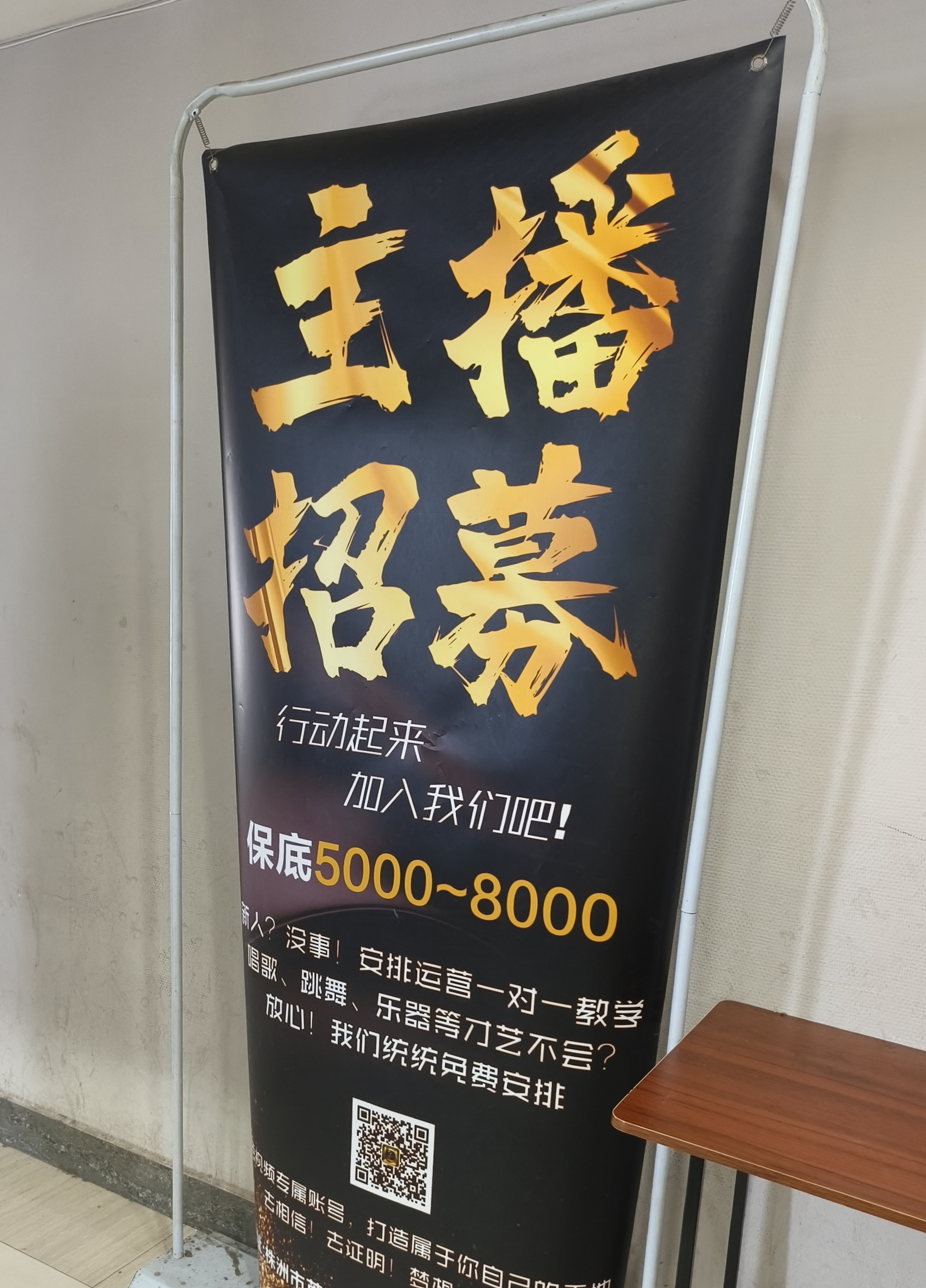 走出株洲简影公司大门,记者注意到,办公地门口立有一块招募主播的宣传海报,宣称保底5000元至8000元,不限经验、不限才艺,公司免费安排培训。