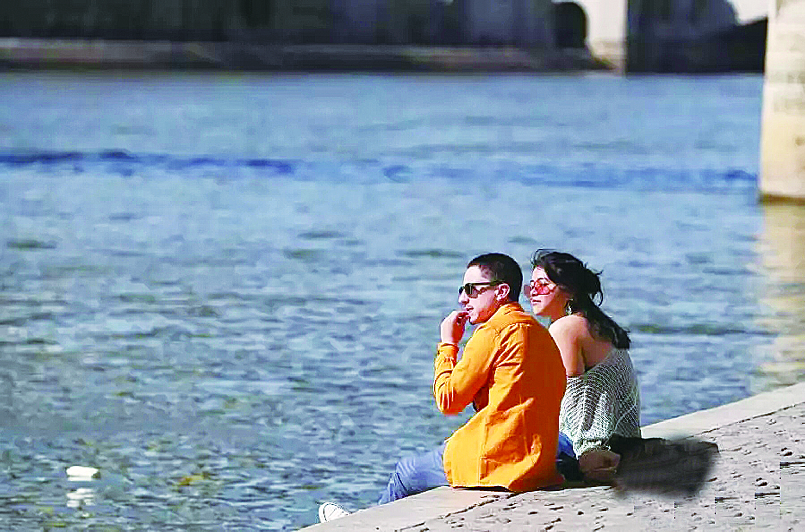 一对情侣在法国巴黎塞纳河畔晒太阳。图据新华网