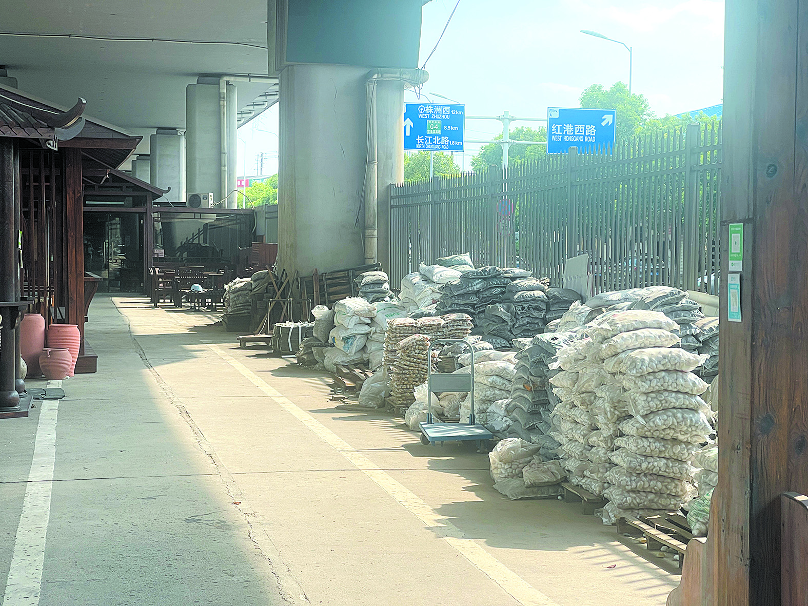 ▲芦淞大桥河东桥下,桥下空间堆放了众多建筑材料。记者/伍靖雯 摄