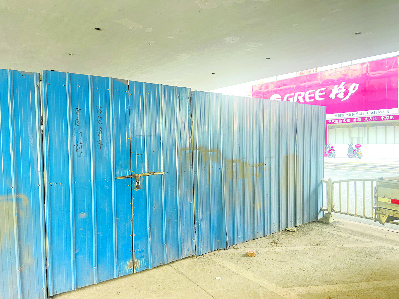 7月16日,芦淞大桥河东段的引桥下,一长排蓝色的铁板将桥下部分空间严严实实围了起来,靠外侧的铁板“大门”上了锁,上面写着“仓库门前,请勿停车”字样。