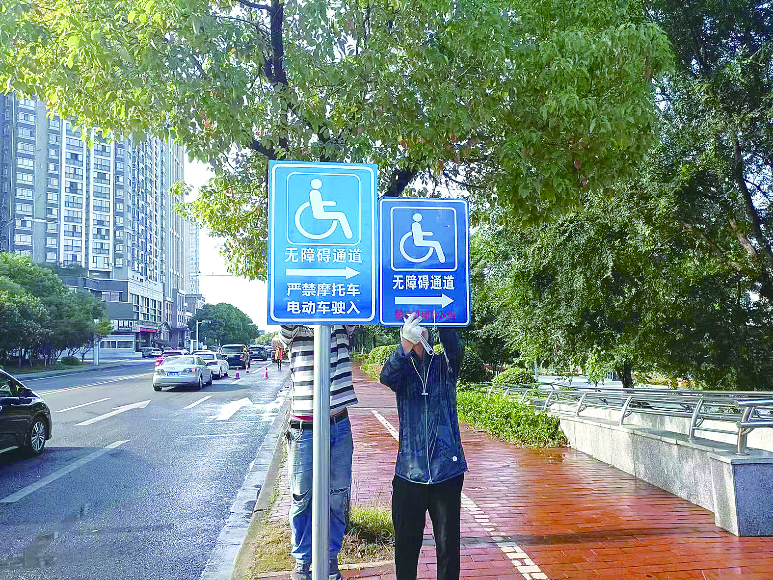 在无障碍入口处竖立新标示标牌。记者发现,新的标牌明确规定“严禁摩托车、电动车驶入”。白底、红标、黑字极为醒目。下午5时,赶制出来的标示标牌正在全线安装。项目部负责人表示,9个无障碍通道入口的标示标牌当天会全部安装完毕。