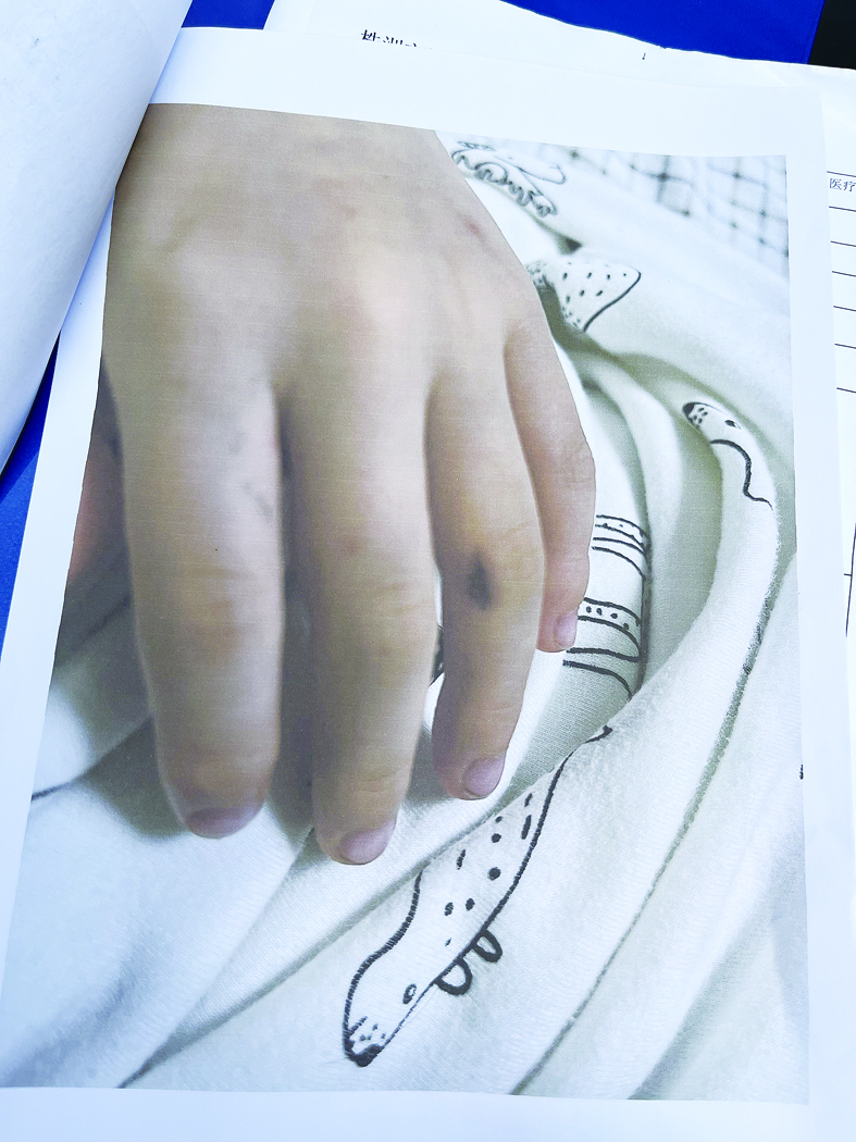 小宇手指上出现“电击伤口”。 记者/刘平 摄