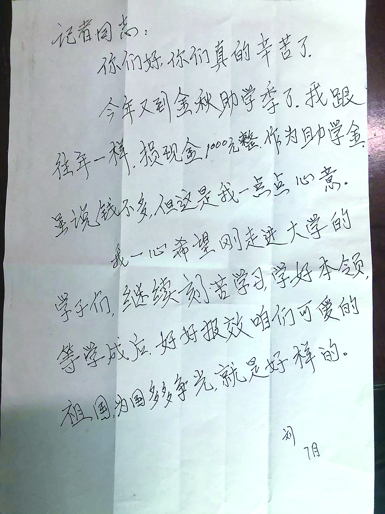 7月21日上午,姜女士来到报社,代母刘运秀捐款1000元,并带来了母亲的一封信。近几年,刘运秀老人参加金秋助学,每次都是委托其女“代劳”。