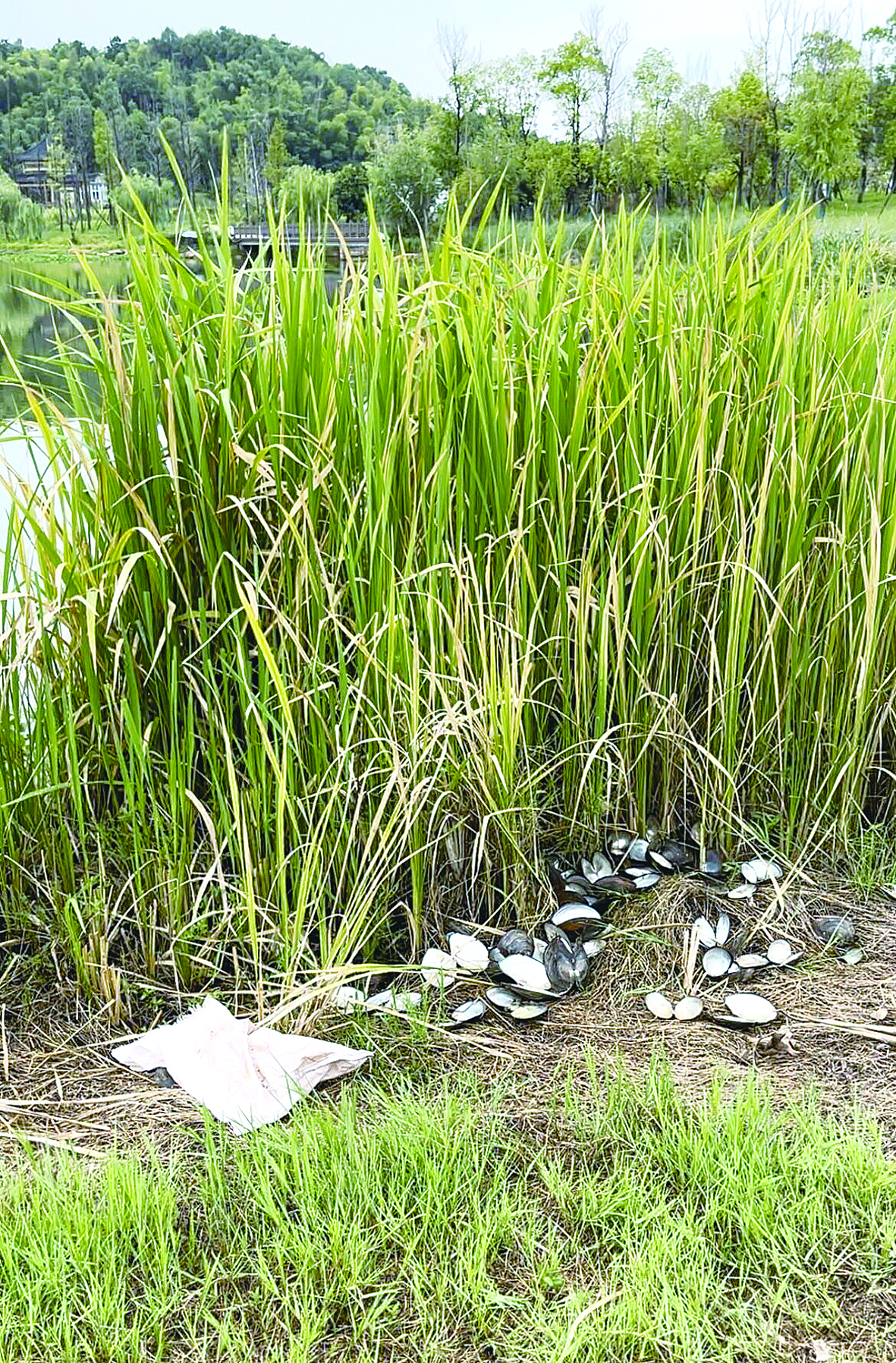 明照湖岸边,有不少丢弃的河蚌壳。 记者/刘平 摄