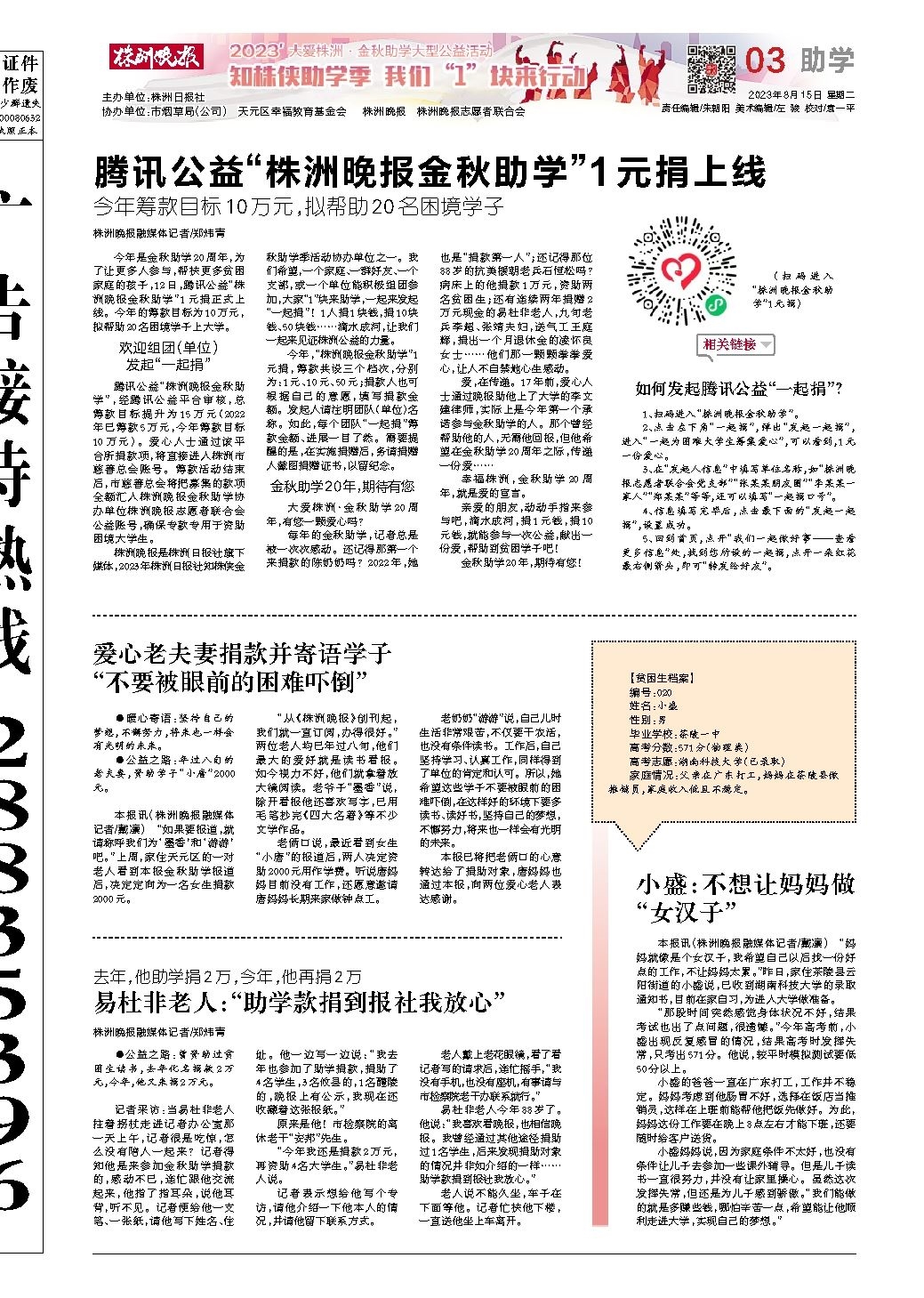 腾讯公益“株洲晚报金秋助学”1元捐上线