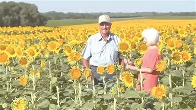 美国堪萨斯州普拉特市以东约6公里的农田里,近日开满了金灿灿的向日葵。它们并非真正意义上的农作物,而是一位名叫李·威尔逊的农民送给妻子勒妮·威尔逊的结婚五十周年礼物。