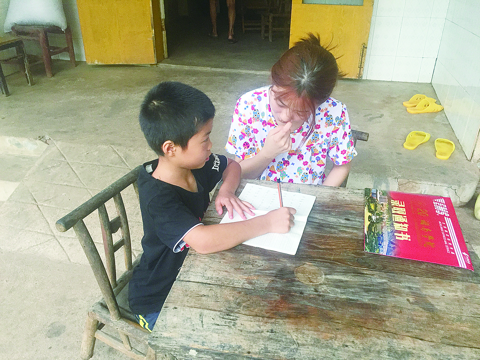 小李在给弟弟补习作业 记者/杨凌凌 摄