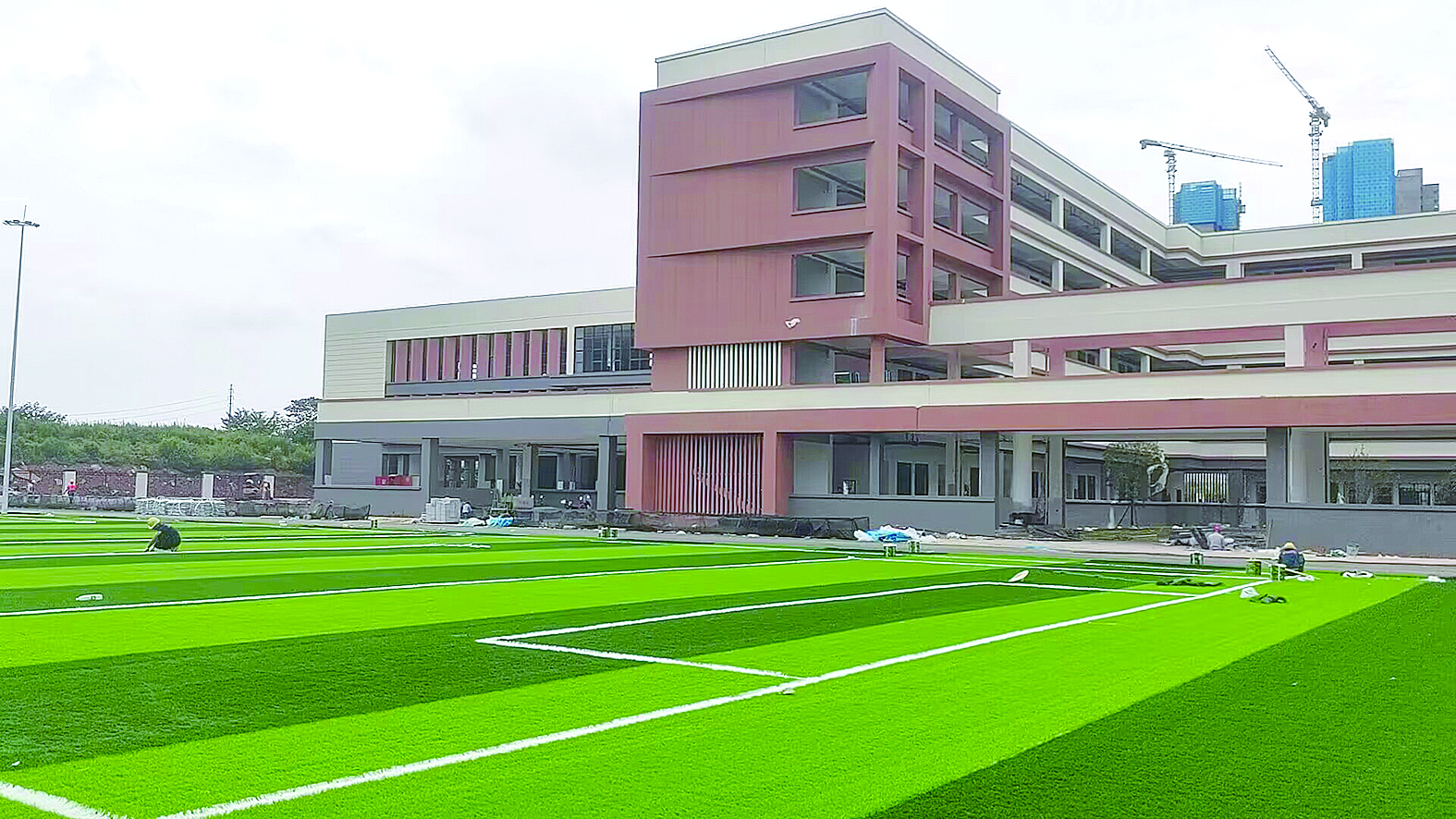 记者在现场看到,所有主建筑已全部建成,仿生草坪已铺设到位,教室里风扇、护眼灯已安装完毕,一部分室内装修和室外附属工程正在收尾。