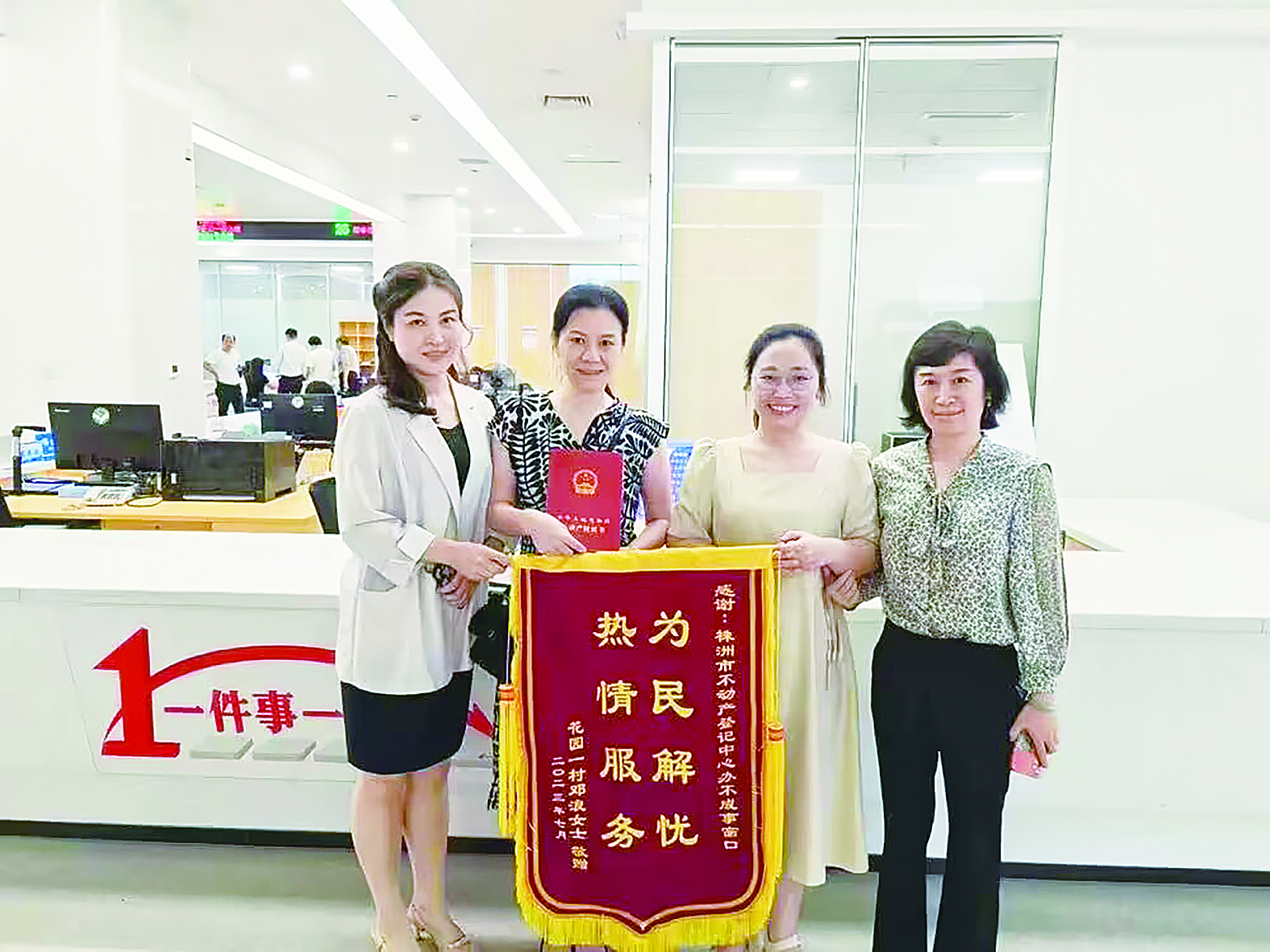送锦旗为市民邓女士。原来,她早在1995年购买了一套位于天元区花园一村的商品房,由于当时长期在外省工作,加之办理手续不齐全,承建开发商已注销等原因,导致一直未能办理不动产权证。
