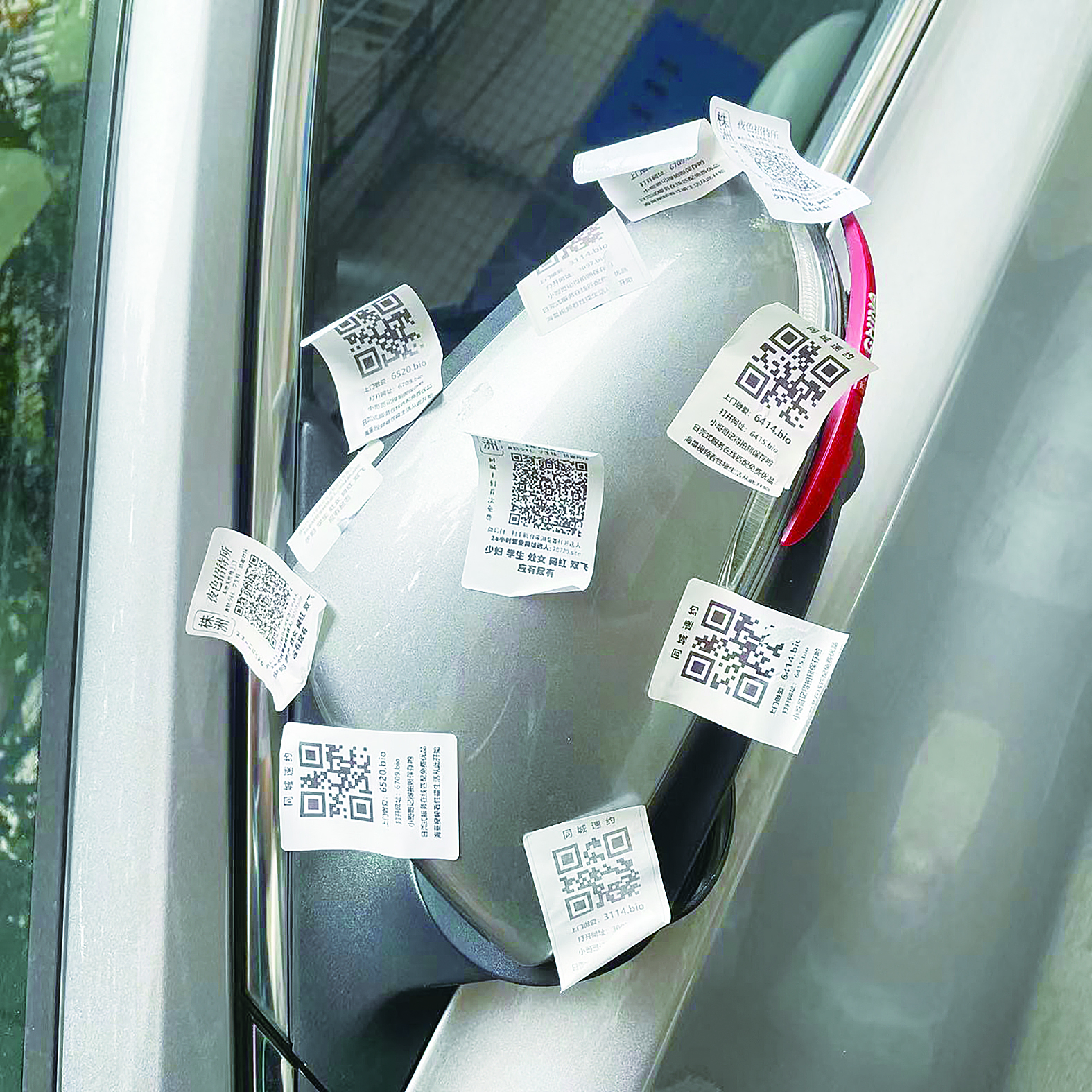 昨日,记者实地走访了石峰区仁和小区、响石花园等多个小区,发现停在小区公共区域的车辆倒车镜上几乎都被贴了带有二维码的白色小广告,少数几辆没有被贴小广告的车辆,倒车镜上也残留有不干胶的痕迹。据小区一位姓张的师傅介绍,因为没有买车库,他的小车只好停在小区的道路边上,每天早上上班,就会发现,头一天撕掉的小广告,第二天早上就会重新被贴上,真是不胜其烦。后来实在没有办法了,就学邻居的样,停好车后,拿两个塑料袋分别绑在两个倒车镜上。然后发现,第二天塑料袋上也满满地被贴了好多小广告,“开车的时候,再把塑料袋取下来,虽然这个办法有点效果,但这也不是长久之计啊。”张师傅无奈地说。