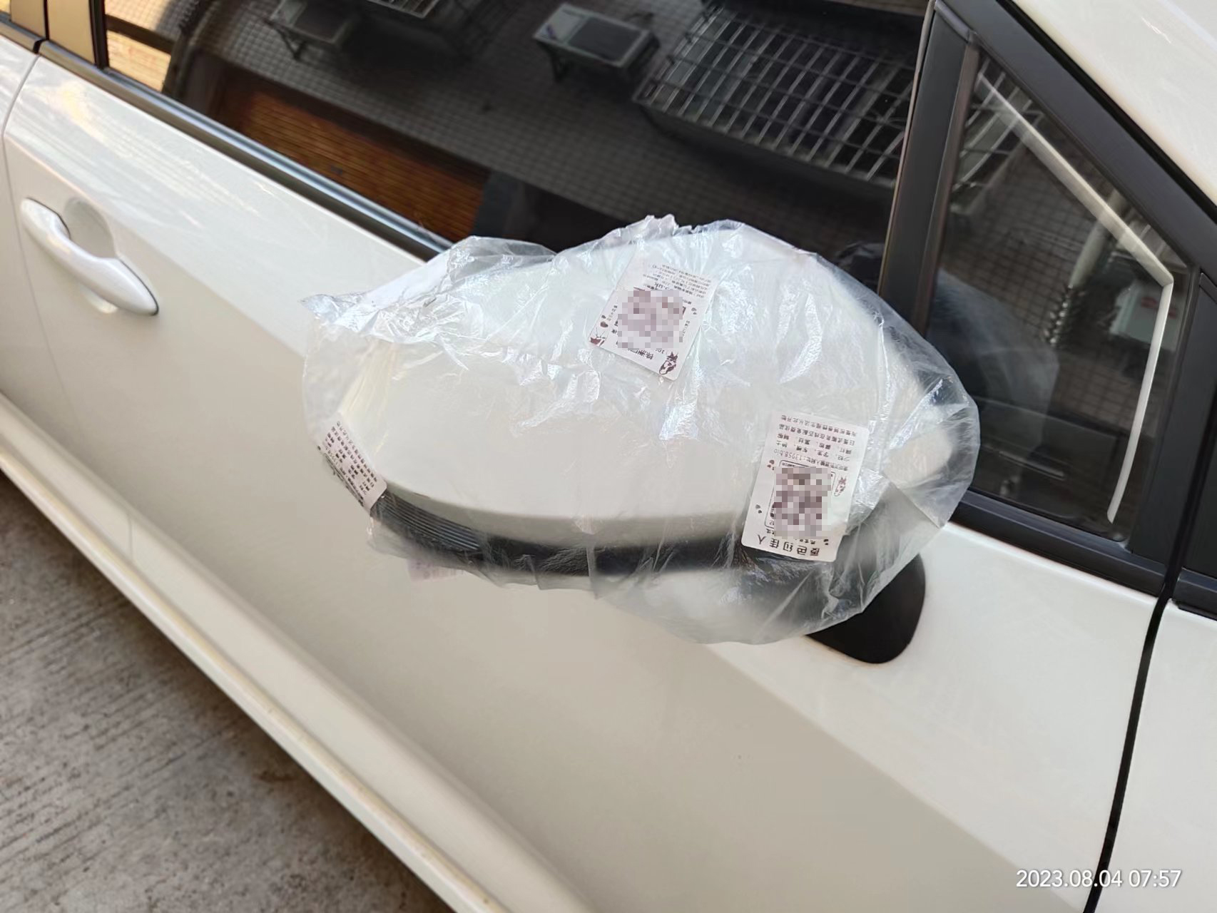 小区居民用塑料袋包好倒车镜。记者/李曙光 摄