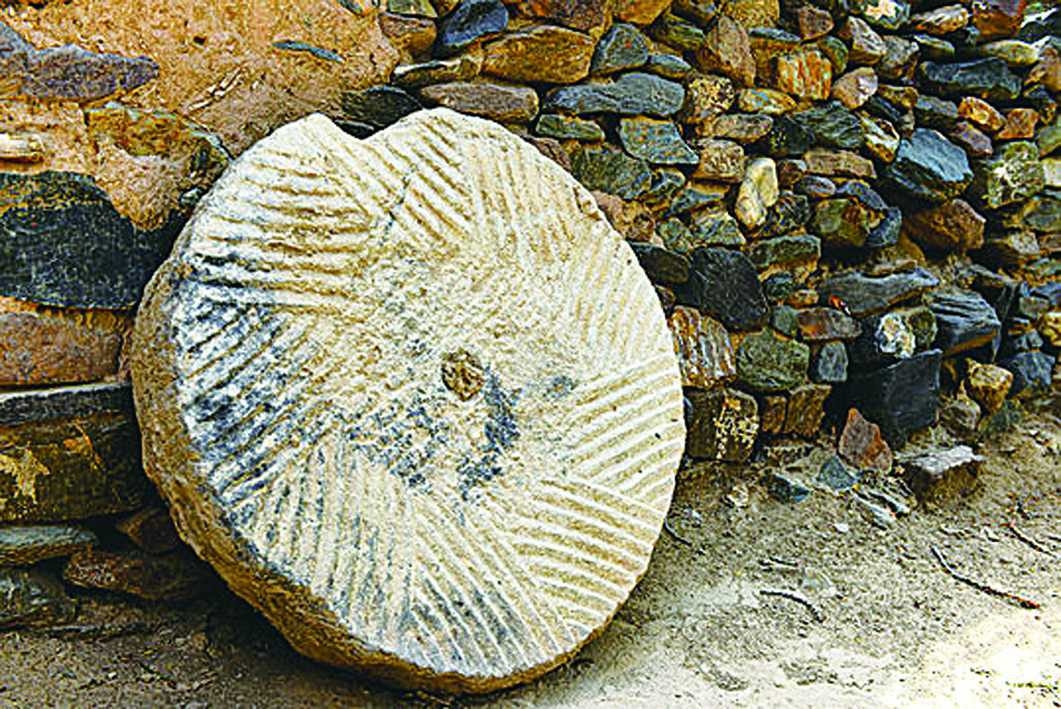 这里的景色美极了,我一时被迷住了,竟然忘记了今天来此的目的。待回过神来,才想起石磨的事来。石磨在哪个地方呢?当时年岁太小,时间隔得太久,已记不住石磨到底在哪个位置。于是,我带了一根1米多长的树枝,拨开杂草灌木,往塔北边方向寻找,这地方看看,那地方瞧瞧,左寻右找,四处搜遍,就是没见石磨踪影。只好返回往东门塔南边找,沿着山沟,跨过小溪,穿行在齐膝高的杂草中,终于在一个树林阴翳茅草丰茂的地方找到了它。我眼睛一亮,高兴得直跳大喊,石磨石磨你怎么不告诉我,你在这里呢?真是踏破铁鞋无觅处,得来全不费工夫。