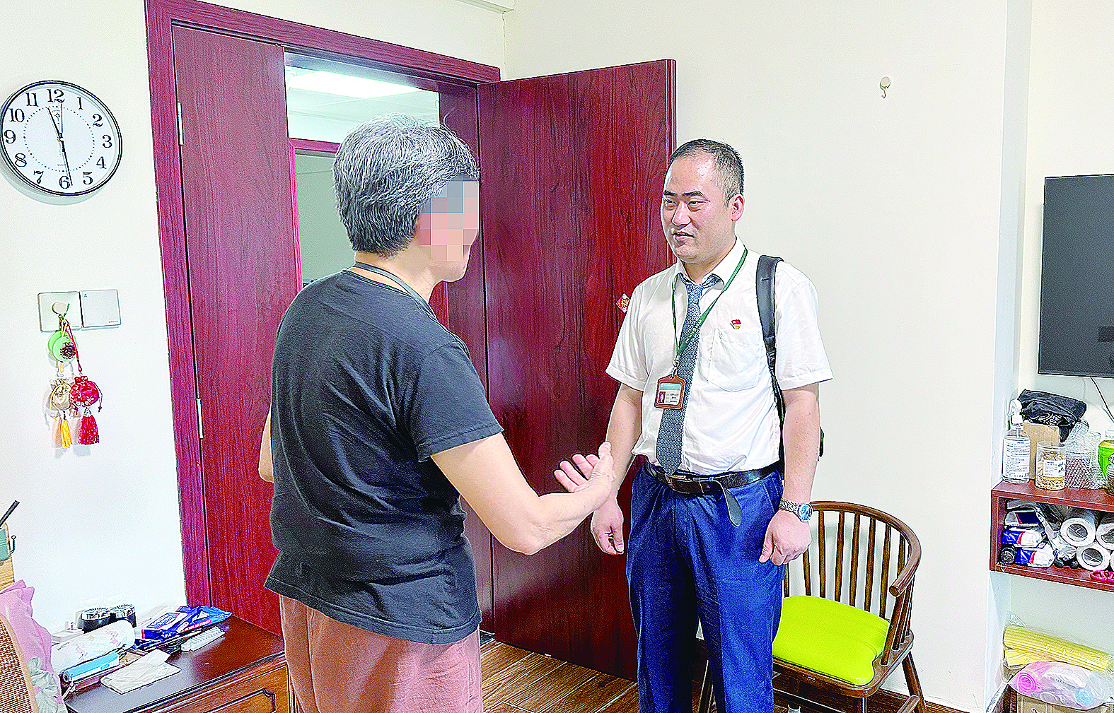 在记者介入下,保险公司工作人员终于见到了投保人(左)。
