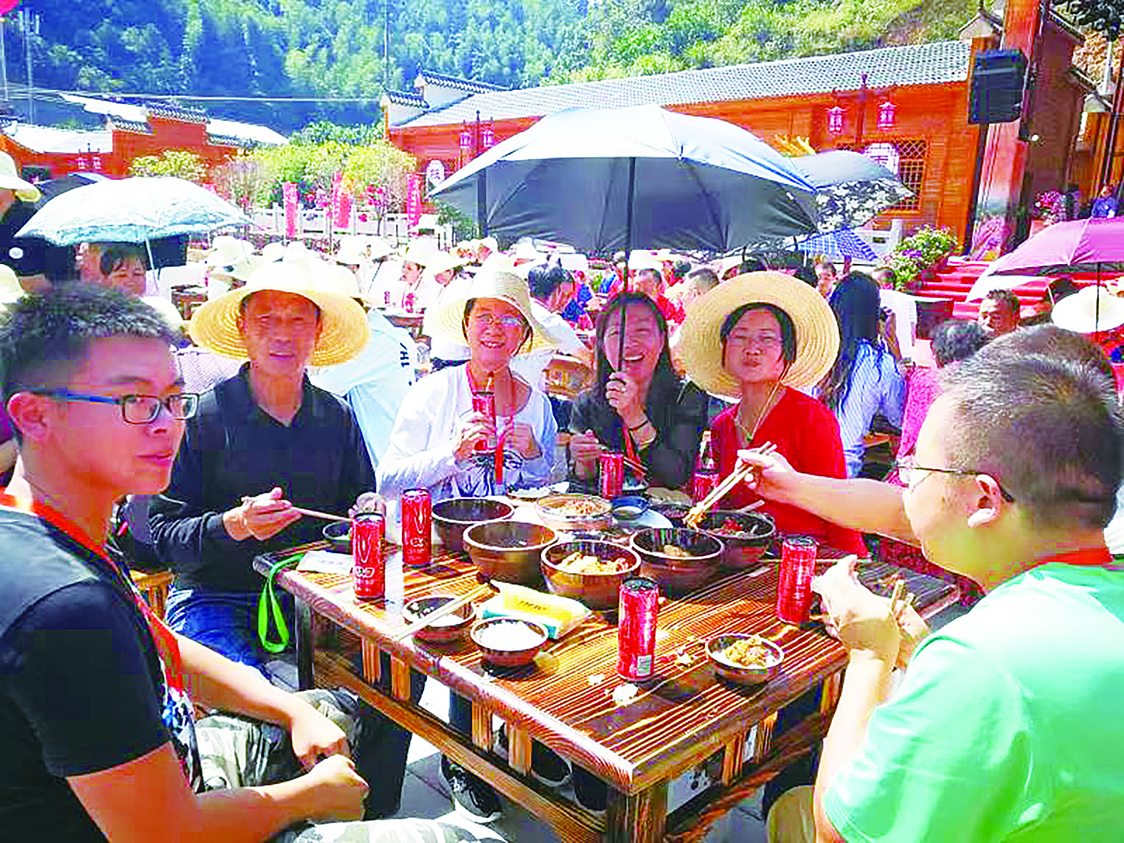 近日,游客们趁着周末在茶陵县火田镇卧龙村体验农家菜。