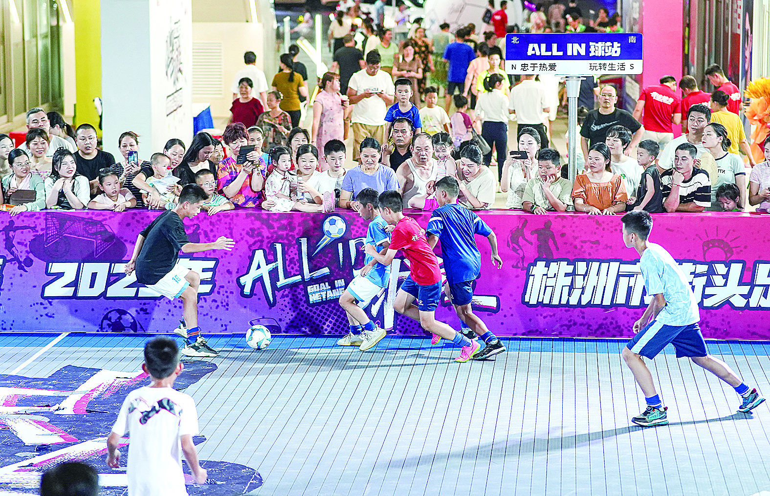 在荷塘区世贸广场夜市,市民们观看街头足球争霸赛。