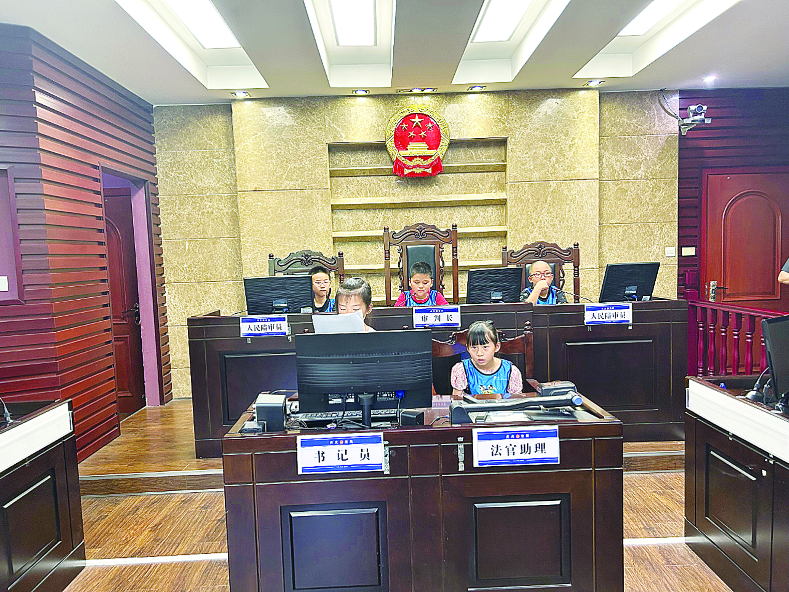 7月末,天元区30多名青少年儿童在志愿者的陪伴下,走进天元区法院,当一次“小小法官”。这是“新区童行”系列中的“法学院”活动现场。