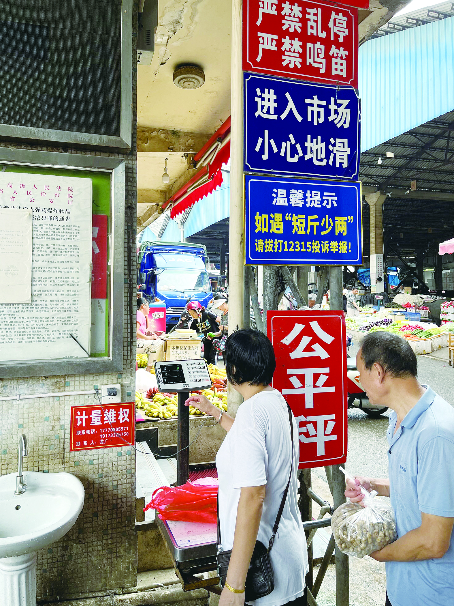 15日上午,本报记者在中南菜市场正门处发现,正门左侧设有公平秤标牌,摆放有电子秤,挂有计量维权提示。不时有市民将购买的物品放在电子秤上“过秤”。“准!”“没少秤!”……多个使用公平秤的市民说。