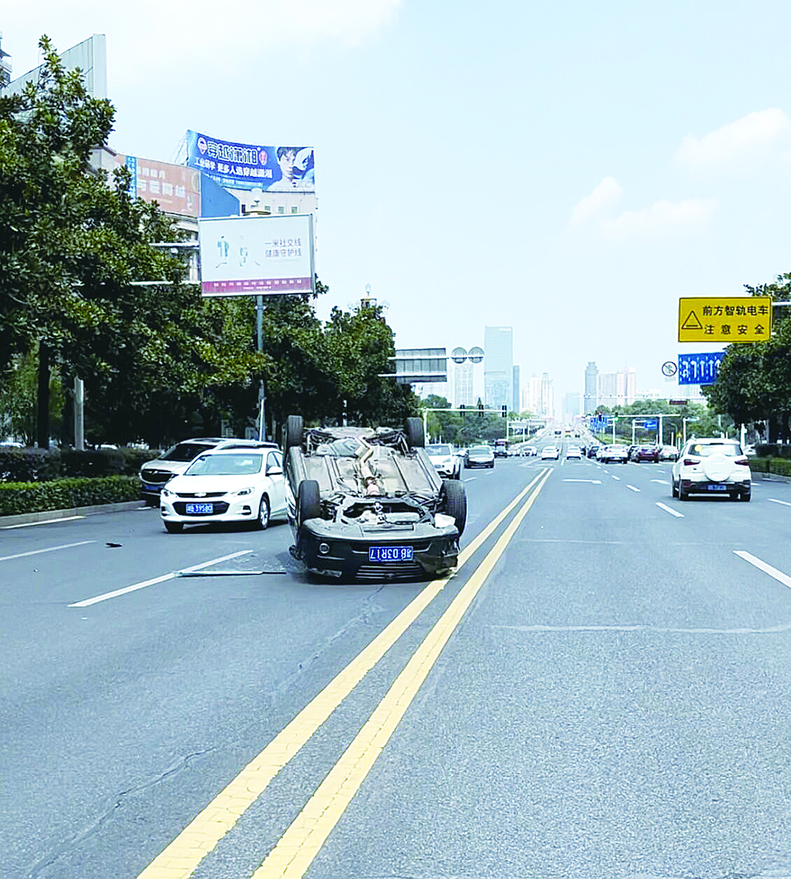 近日,天元区天台路发生一起车祸。目击者介绍,一辆直行车辆与一辆从路边停车场驶出的车辆相撞后,仰翻在道路中间。事故发生后,有保安主动上前施救。仰翻的车辆内只有一名男性驾驶员,所幸人无大碍。