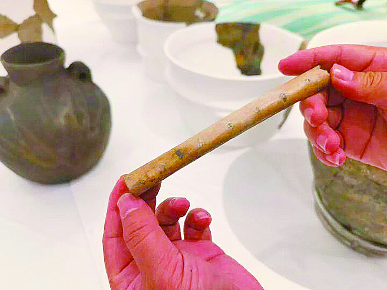 考古专家在展示草堰港遗址出土的六孔骨笛。