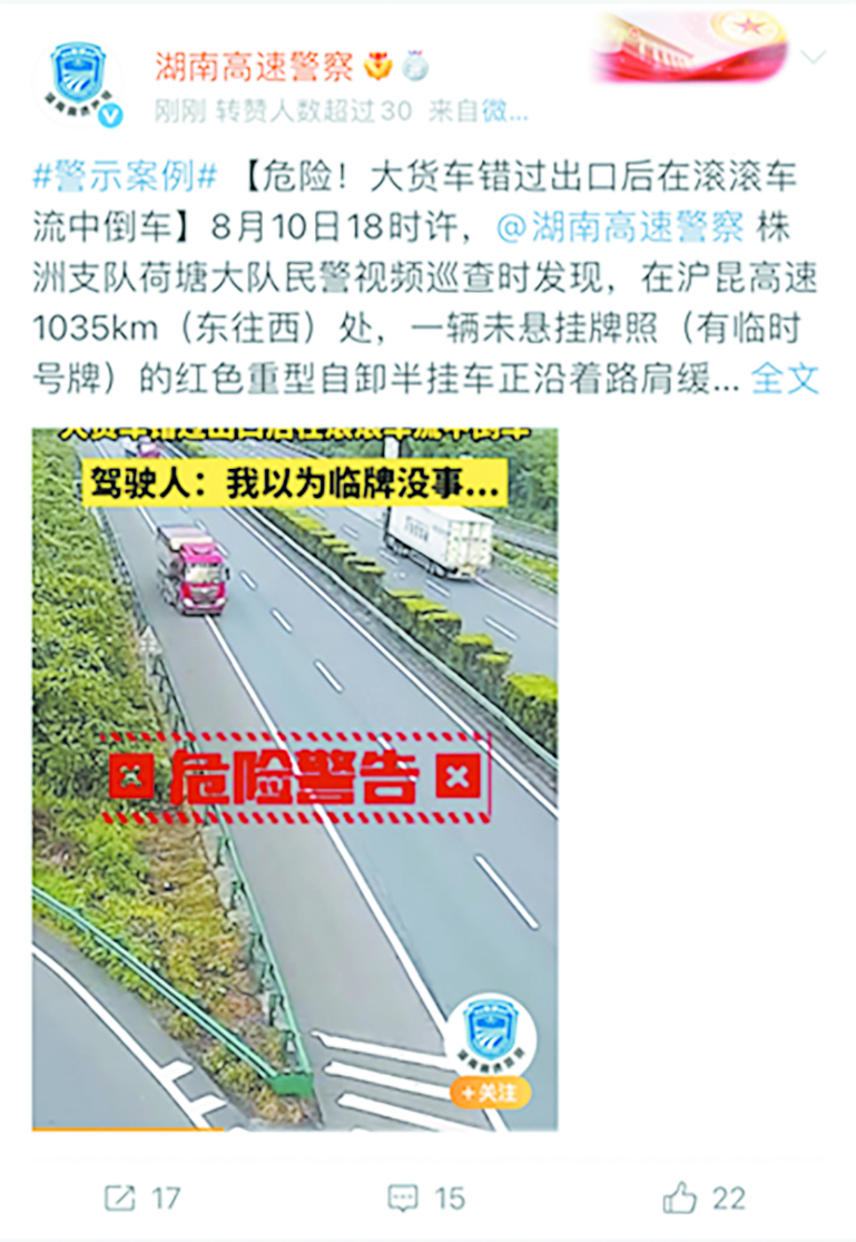 近日,省高速公路交通警察局株洲支队荷塘大队民警视频巡查时发现,在沪昆高速1035km(东往西)处,一辆未悬挂牌照(有临时号牌)的红色重型自卸半挂车正沿着路肩缓慢向后倒车,对该路段的通行秩序及过往车辆的行车安全造成严重威胁。民警立即前往处置。经询,该车驾驶人陶某原本打算从株洲东收费站驶下高速,但由于没有注意观察路牌,错过路口,于是抱着未上牌照的侥幸心理铤而走险选择倒车。民警对陶某进行了严厉的批评教育,对其高速公路倒车的违法行为依法处罚。