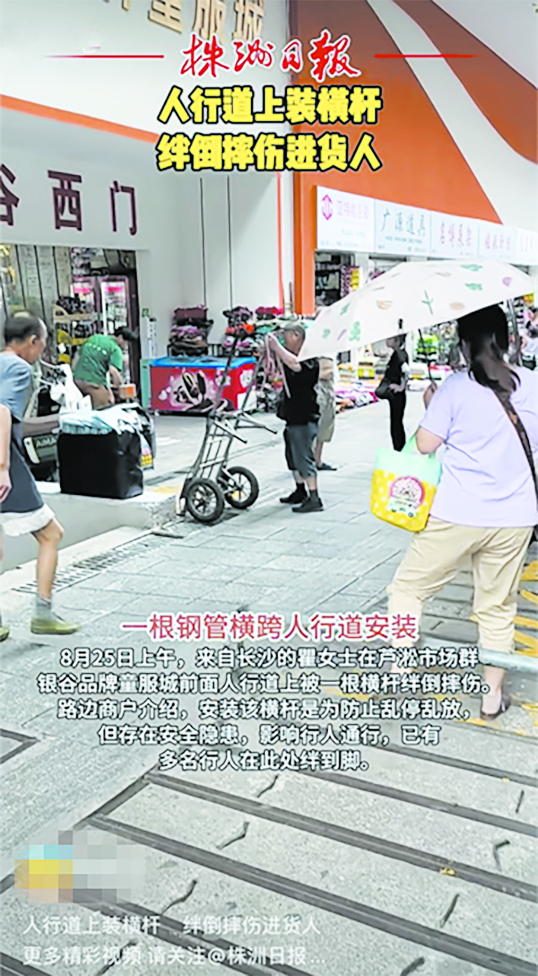 近日,来自长沙的瞿女士在芦淞市场群银谷品牌童服城前面人行道上被一根横杆绊倒摔伤。路边商户介绍,安装该横杆是为防止乱停乱放,但存在安全隐患,影响行人通行,已有多名行人在此处绊到脚。